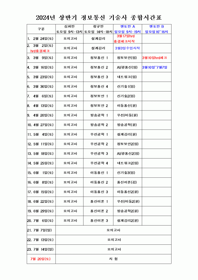 2024년 상반기 정보통신기술사 전체 시간표입니다. 정규반과 심화반은 일정만 참고하시되 과목별 수업은 차후 재 공지 예정입니다.^^ 멘토반 1,2 반은 각 담당 기술사님께서 개인별로 공지하고 있으므로 참고하시기 바랍니다.