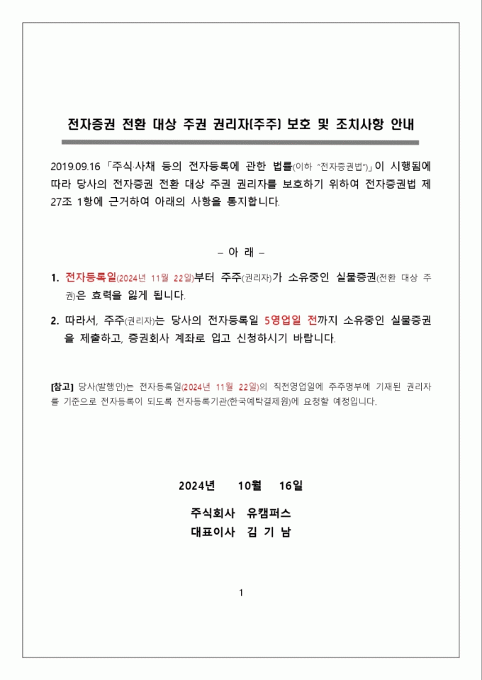 전자증권 전환 대상 주권 권리자(주주) 보호 및 조치사항 안내