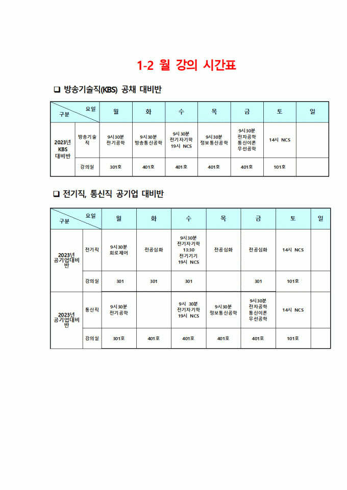 2024년 1~2월 시간표 안내