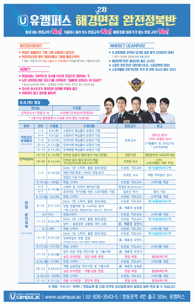 2019년 2차 해경 필기시험에 합격하신 모든 분들께 축하드립니다. 첫 관문인 필기를 통과하셨다는 기쁨은 잠시 ~~ 아직 남은 체력과 인적성 그리고, 면접이 남았습니다. 필기에서는 채용 인원의 2배를 합격시켜 2:1의 경쟁만 남았다는 것은 기쁜 일이지만, 너와 나중 1명만 채용된다고 생각하면 아직 긴장의 끈을 놓을 수 없는 일입니다.~~ 마지막까지 최선을 다하기 위해 저희 유캠퍼스에서 1차 완전 정복반에 이어 2차에도 준비를 했습니다. 첨부된 동영상은 정복반 등록을 결정하시는데 참고하시기 바랍니다. 보다 확실한 판단을 하실 수 있으리라.~~ 감히 생각해 보며, 마지막까지 최선에 최선을 다하며~~ 필기만 4번 합격하고, 면접에서 떨어졌는 줄 알았는데 (?) 이번엔 합격해야하는데 벌써 마흔 (40살) 어쩌다 보니 올해가 마지막 였다는 어느 면접자의 면접 내용 ~~( 정말 안타까운 상황이죠. ) 누군가 전문가의 도움을 직접적으로 받는다면 ~~ 그 전문가가 해경 면접 위원장이라면 ~~ 그 전문가가 해경 출제 위원이었다면 ~~ 인적성 검사는 검사지를 한번 풀어 본다고 최선을 다했다 할 수 있을지. 함께 생각해보는 시간이셨다면 좋을 것 같습니다. 대한민국 청년이라면 체력은 문제가 없을 듯 합니다. 다만, 인적성 검사와 면접도 대한민국의 청년으로서 ~~ " 준비된 자 "인지 다시 한번 심사숙고 하시길 바랍니다. 진심으로 마지막 관문까지 ~~ ^&^ 화이팀 ! ! !