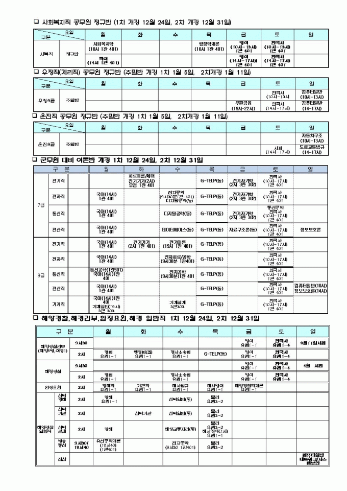 2025년 12월 공무원, 군무원시간표