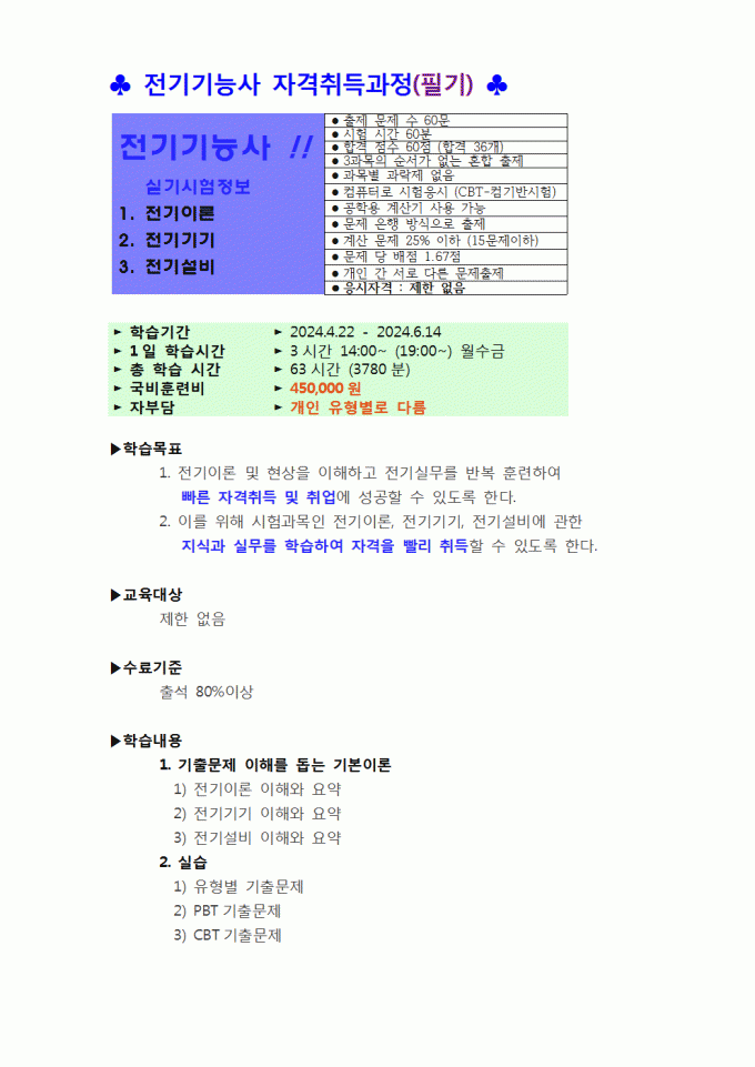 2024년 전기기능사 3회필기 개강안내