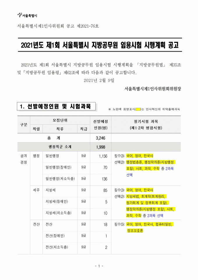 첨부파일 : 파일 2021년도_제1회_서울특별시_지방공무원_임용시험_시행계획_공고_1_.hwp